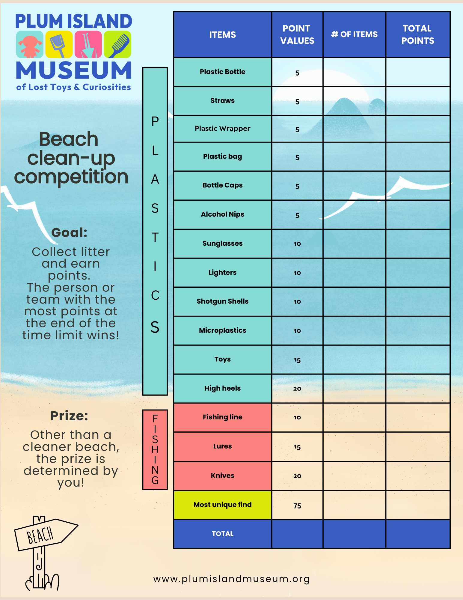 Download and print this scavenger hunt for your next trip to the beach. Turn cleanup into an adventure! Hunt for “trash treasures,” see what you can find, and help keep the beach beautiful while you’re having fun.